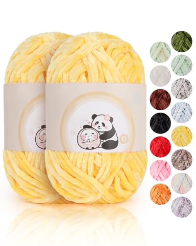 Aeelike 2-pack Chenille-garn, för virkning, stickfilt, 87 meter (80 m) / skein mjukt superskrymmande garn, fluffigt sammetsgarn för nybörjare och stickade gör-det-själv-hantverk, ljusgul