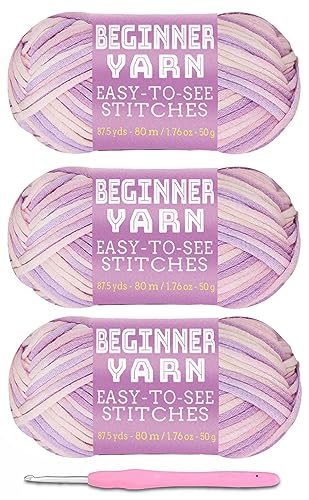 3 x 50 g nybörjare rosa lila garn, 260 meter rosa lila garn för virkning, stickning, lättse sömmar, kamgarn medium #4, tjockt bomull nylonblandning garn för virkning