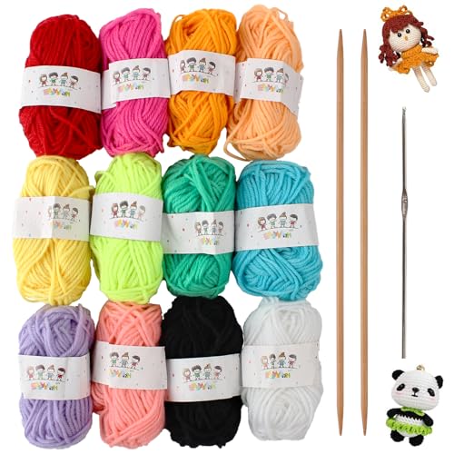 JRJRN 12 färger bomullsgarn för nybörjare, bomullsgarn för virkning, ull för virkning, stickning, bomullsvirkgarn med bambu-pull nål/järnvirknål för hantverk av barn