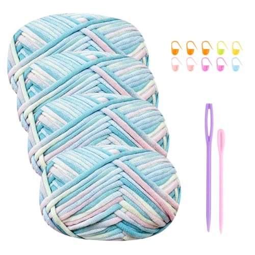Tjockt garn för virkning, bomullsgarn tjock ull för virkning 3 x 50 g virkat garn för nybörjare amigurumi-garn med 4 mm virkade krokar, lätt virkat startkit (regnbåge)