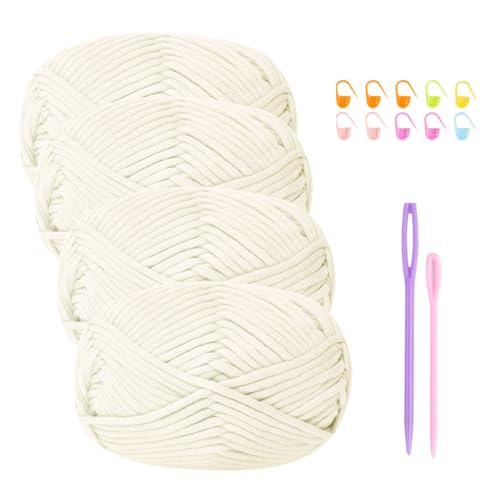 Tjockt garn för virkat bomullsgarn för virkad tjock ull 4 x 50 g virkat garn för nybörjare virkning ull stickgarn med virkade tillbehör, vitt garn