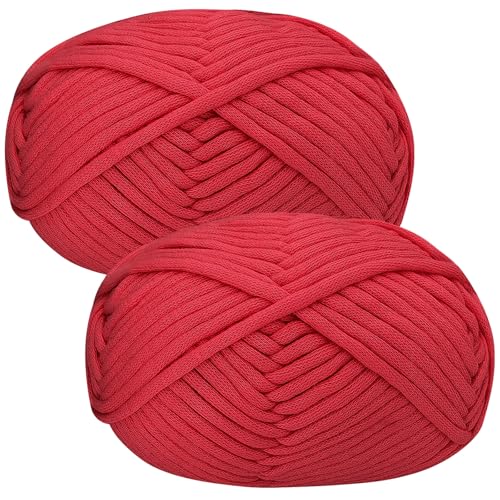 T-shirt-garn för virkning, virkgarn, tjock ull för virkning, 2 x 100 g tjockt garn med 6 mm virknål, virkat garn för nybörjare, elastiskt tygduk, stickat t-shirt-garn (röd blandning)