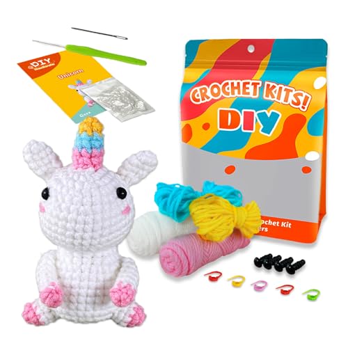 Afufu virkset för nybörjare, gör-det-själv virkning set syset för barn vuxna födelsedagar present, enhörning djur virka kreativt stickset för nybörjare barn från 8 år med virknålar garn och video