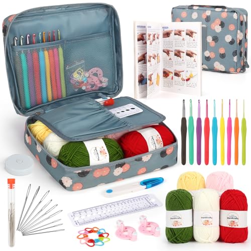 Aeelike Blå blomma virkset för nybörjare, ergonomisk virknål med mjukt grepp för artritiska händer, instruktioner och virkgarn, 2,0–6,0 mm