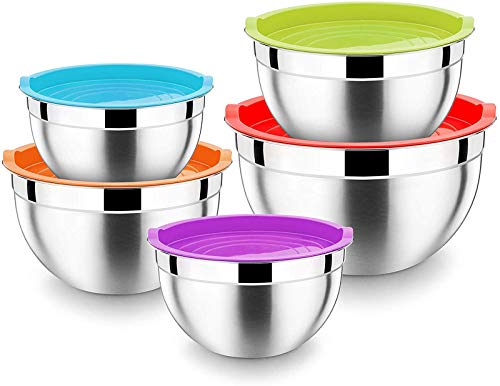 HaWare Vispskål set om 5, salladsskål i 100 % rostfritt stål med lufttätt lock – 4,5 l/2,7 l/1,5 l/1,2 l/0,7 l, perfekt för matlagning/bakning/förvaring, stapelbar och diskmaskinssäker