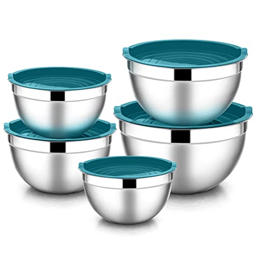 HaWare Vispskål set om 5, salladsskål i rostfritt stål, med lufttätt lock – 4,5 l/2,7 l/1,5 l/1,2 l/0,7 l, perfekt för matlagning/bakning/förvaring, stapelbar och diskmaskinssäker – blå