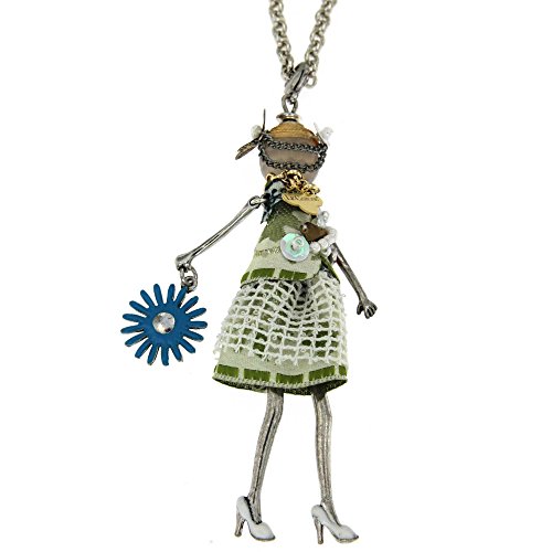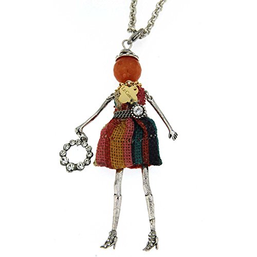 Le Carose Damhalsband Klassisk kollektion. Juvelen är mässing docka med vit elektroplätering och handsydd tygklänning. Storlek: 80 cm halsband, hänge 10 cm, krok 1, medium, Brons, Ingen ädelsten