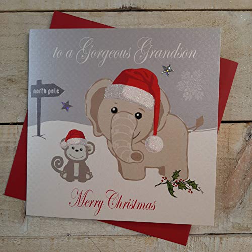 Vita bomullskort till en underbar barnson merry, handgjord julkort. (Elefant och apa, kod xx14-36)
