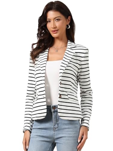 Allegra K Dam långärmad nedvikbar krage knapp randig blazer jacka, Vit/överflödig trädgård, M