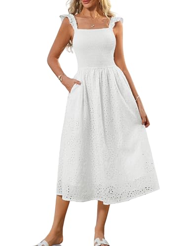 GRACE KARIN Vardaglig klänning för kvinnor boho-stil med volanger remmar spets öljett elegant A-linje sommarklänning, Vitt, L