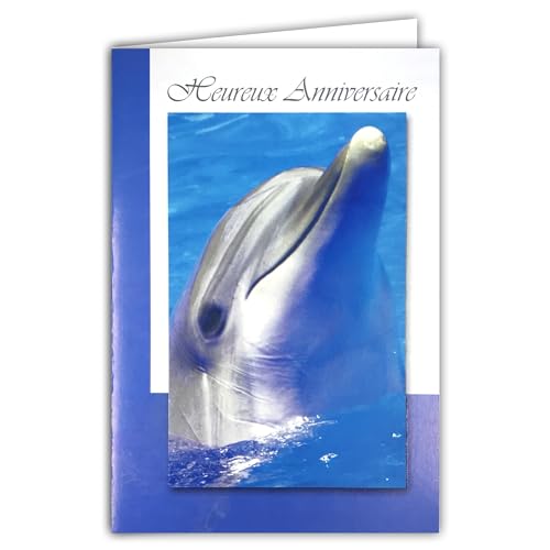 C1050/1 Grattis på födelsedagskort med beige kuvert - leende delfin som sticker ut huvudet ur det turkosa blå vattnet havet - kort som öppnas på en vit interiör för att skriva ditt meddelande