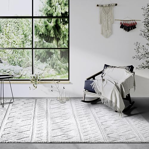 FREOSEN Vardagsrumsmatta, sovrum, vit, 160 x 230 cm, lång lugg, sovrumsmatta, fluffig, mjuk matta med lång lugg för vardagsrum, sovrum, soffa