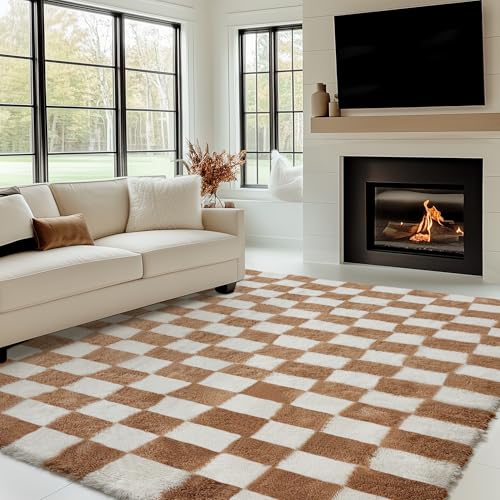 HUGEAR Rutig Hög Lugg Matta Vardagsrum 160x230cm Brun Vit Mjuk Modern Mysig Fluffig Barnmatta Halkfri Tvättbar Stor Mattor Flickor Sovrum Barnrum Lurvig Golvmatta