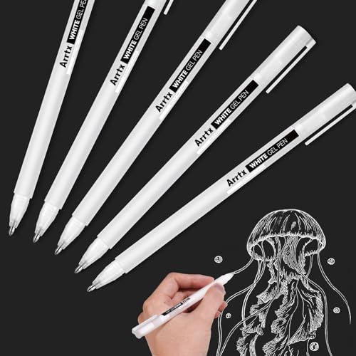 Arrtx Gelpennor vita för ritning 5 stycken 1 mm vit gelpenna för höjdpunkter, konstnär, fineliner vit gelpenna för mörka papper, skissa