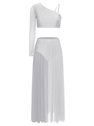 Agoky Balettklänning för kvinnor, one shoulder, dansklänning, lyrisk klänning av ärmlös/långärmad, crop topp, glitter, danströja och midi, lång kjol med trosa, Vit, M