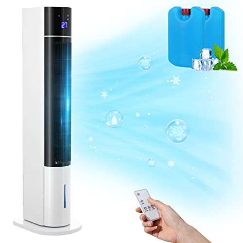 104 cm golvfläkt med fjärrkontroll och vattenkylning, 4-i-1 med kylning fuktrengöring, 50° svängning, 12 timmars timer, tyst för sovrum, vardagsrum, vit