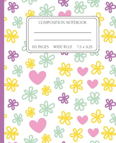 Composition Notebook – White with Yellow, Teal & Purple Flowers and Pink Hearts | 110 Wide Ruled Pages, 7.5x9.25 | Cute Aesthetic Notebook for School & Everyday Use