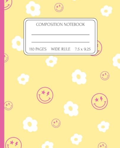 Composition Notebook – Yellow with White Flowers & Pink Smileys | 110 Wide Ruled Pages, 7.5x9.25 | Aesthetic Notebook for School, Homeschool & Everyday Use