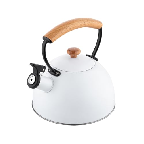 FLORINA Tekanna för Spis (2,3 l) I Tevattenkokare i Rostfritt Stål NATURA I Flöjtkokare med Trähandtag I Automatisk Visselpipa I Vattenkokare för Induktionshäll, Gasspis och Elspis I Färg: Vit