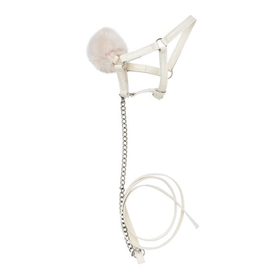 Vit lädergrimma och grimskaft till käpphäst – med härligt fluff & silverfärgade beslag