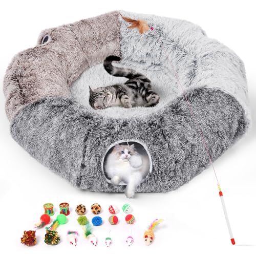 Odoland Stora katttunnlar för inomhuskatter fluffig kattbädd och avtagbara kattgrotttunnlar med 20 kattleksaker, kattmunkstunnel och variation kattunge leksaksset för tugglek