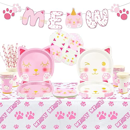 XJLANTTE 107 st födelsedagstillbehör för katter - kattunge MEOW-banderoll, kattpapperstallrikar, servetter, koppar och bordsduk för flicka husdjur katt festdekorationer, servera 20 gäster