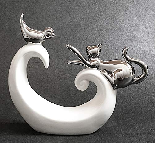 Snygg dekoration med lekande katt och fågel - vit & silver keramisk kattdekoration - modern kattfigur 21cm hög - deco figur med kattunge – kattstaty