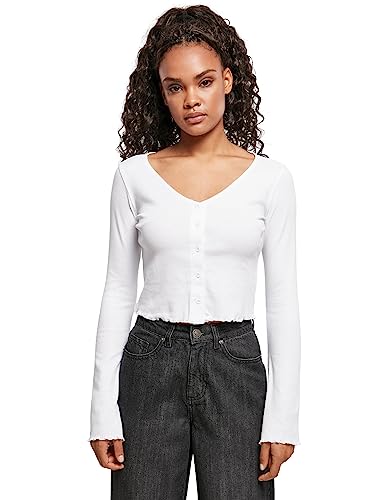Urban Classics Damcardigan topp långärmad, kort jacka topp med rullfåll, ribbstickad kofta med bred V-hals, storlek XS till 5XL, Vit, L