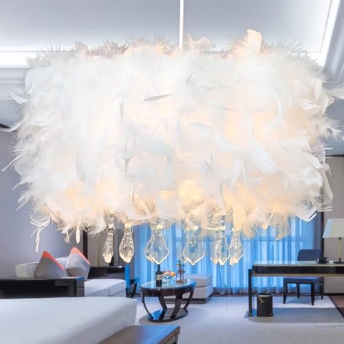 Hängande kristallkrona med fjäder, ljuskrona, vit fjäder, pendellampa, taklampa, romantisk och lyx för vardagsrum, matsal, 38 cm/15 tum