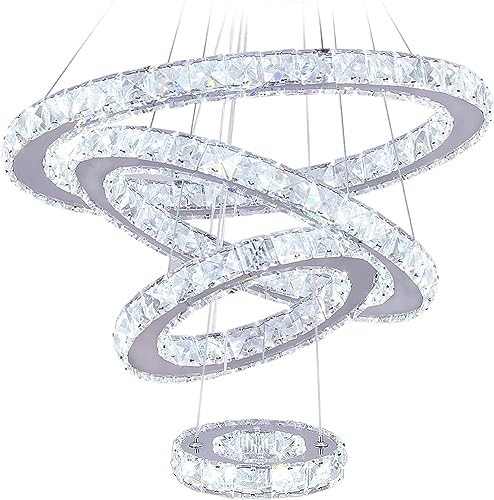 Finktonglan LED-ljuskrona, 4 ringar, modern kristallkrona, matsal, vardagsrum, LED-taklampa, justerbar ljuskrona i rostfritt stål (kall vit)