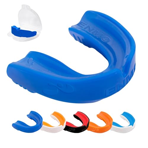 Enmo Maxilla Gel Gum Shield – vuxen och junior 10+ munskydd med fodral för rugby, boxning, hockey och kontaktsport – munskydd med koka och bita, andningskanal, dubbla lager – blå/vit