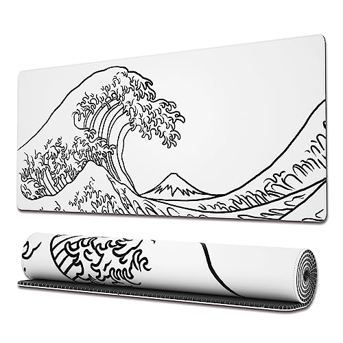 Ovenbird Spelmusmatta med sydda kanter, japansk våg vit musmatta, utökad XL-musmatta med halkfri bas, cool stor musmatta för skrivbord, 80 x 30 cm, vit