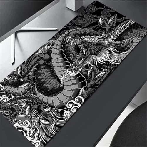 Cekog svart vit drake musmatta (91 x 40 x 0,3 cm) spelmusmatta, utökad stor XXL musmatta skrivbordsdyna, sydda kanter musmatta, halkfri gummibas, spelmusmatta