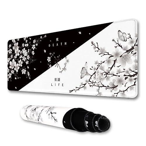 IF FEEL Svart och Vit Körsbärsblomma Musmatta - Yin och Yang Design, XL Stor Skrivbordsdyna med Japansk Sakura, Vattentät Halkfri Gummibas Tangentbordsmattor, 80 x 30 cm