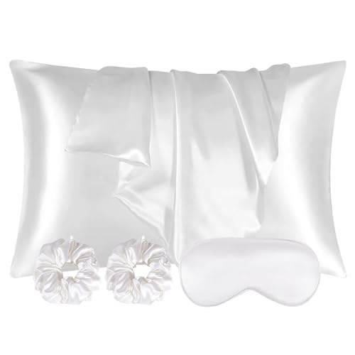 AUAUY 2-pack örngott i satin, 50 x 75 cm, silkesörngott för hår och hud, liknande med siden, med 2 st satinhårsnoddar och ögonmask, halk skönhet sömn satin örngott, silkesörngott (vit)