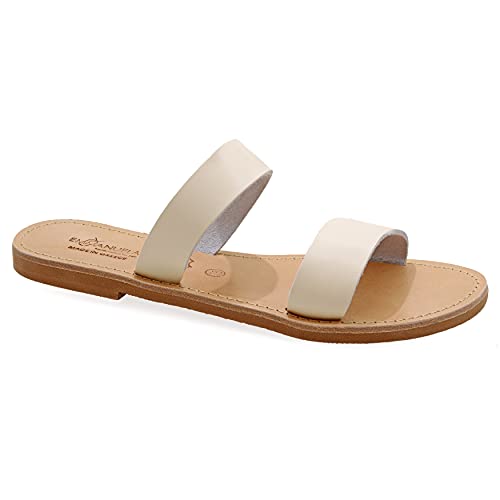 Emmanuela Grekiska handgjorda platta sandaler i läder, kvalitativt glidande på sommarskor för kvinnor, bandreglage, boho chic mules roséguld orm djurtryck leopard croco, Vitt, 38 EU