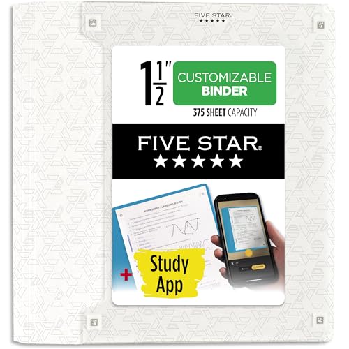 Fem stjärnor 3 ringpärmar, 1-1/2 tums pärm med D-ringar, anpassningsbar klar vy skydd + studieapp, poly, vit (261460A-ECM)