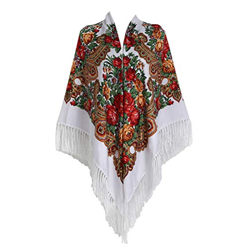 Gudessly Traditionell halsduk för kvinnor, med tofs, fransar, halsduk, huvudhalsduk, retrohalsduk, blommönster, poncho-tryck, Vit/överflödig trädgård, 53 * 53inch