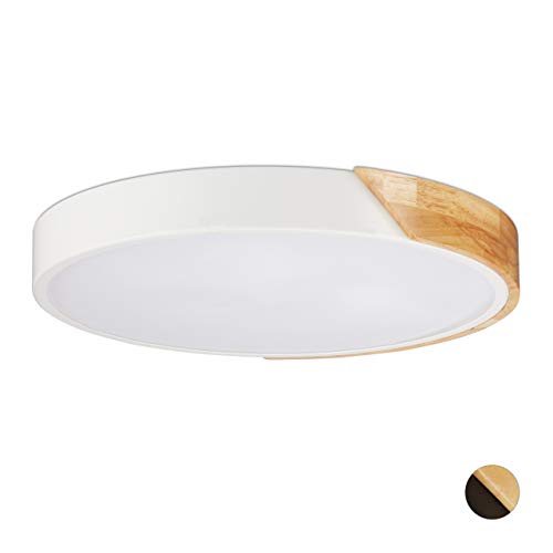 Relaxdays LED-taklampa, 24 W LED halllampa, rund taklampa vardagsrum, trä och metall, H x D: 5 x 40 cm, vit
