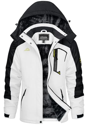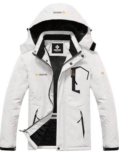 GEMYSE Vattentät skidjacka för män, vindtät fleece, utomhus, vinterjacka med huva, Vit 01, XL