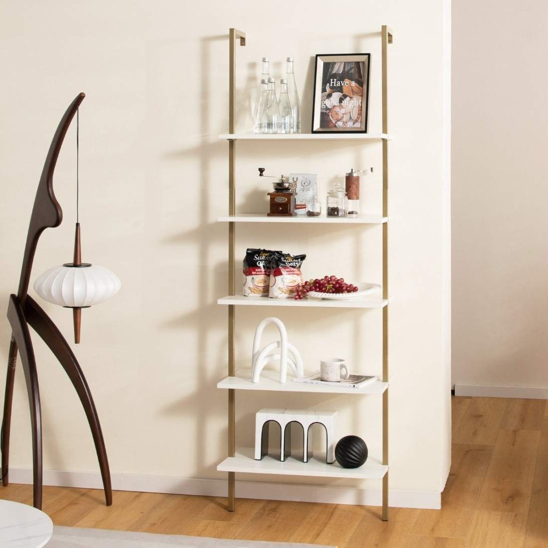 5-vånings steghylla vägghylla med stålram 60 x 30 x 180 cm vit & guld