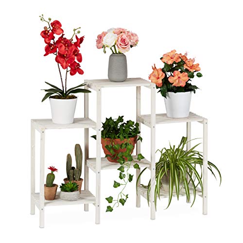 Relaxdays Blomställ i trä, dekorativ steghylla för växter, inomhusbruk, stående, 70 x 89 x 26,5 cm, vit, trä, medium