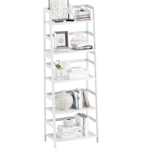 VOVALA steghylla, 5-vånings bokhylla, all bambu heavy duty bokhylla, fristående öppen träförvaringsställ, modern hörndisplay växtställ för vardagsrum, hemmakontor, badrum, sovrum, Vit