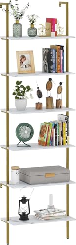 Huhote steghylla, väggbokhylla med 6 nivåer, bokhylla, väggmonterad, bokhylla, öppen hög bokhylla med metallram, industriell hylla för vardagsrum, kök, kontor, sovrum (vit/guld)