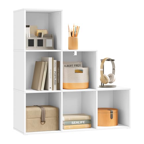 WOLTU Bokhylla med 6 fack, kubhylla, trapphylla, steghylla, stående hylla, för vardagsrum sovrum barnrum kontor, vit, 90,5 x 90,5 x 30 cm, SK061ws