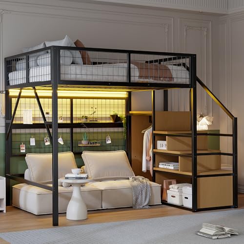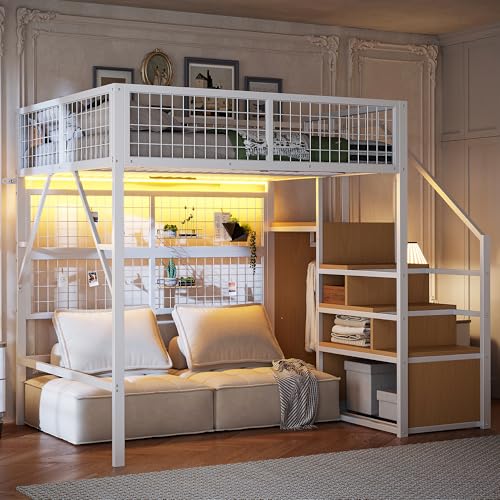 Järnsäng, våningssäng, våningssäng 140 x 200, lämplig för barn och tonåringar mångsidig, metallvåningssäng med APP-styrda L-E-D-ljuslister trappor med förvaringsutrymme, öppen garderob vit