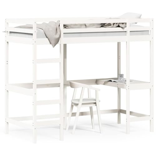 Gecheer Loftsäng med skrivbord, hög våningssäng med stegar och träram, platsbesparande, för barn och vuxna, 90 x 190 cm, massivt furuträ, vit