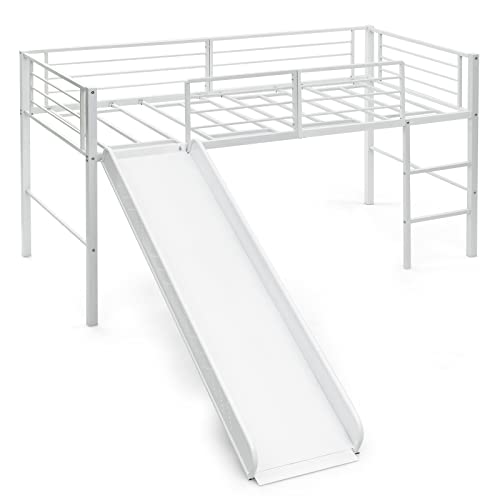 GIANTEX Loftsäng för barn med halkskydd, sängram i metall, 96 x 198 x 109 cm, barnsäng med fallskydd, och stege, våningssäng, våsäng med ribbotten, sängram, metallsäng kan belastas upp till 150 kg