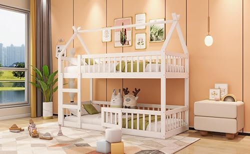 Zyloyal10 Barnsäng, trädhus med rutschkana och stege, 90 x 200 cm, våningssäng för barn – 2 x ribbotten – natur och vit (vit och natur – D)