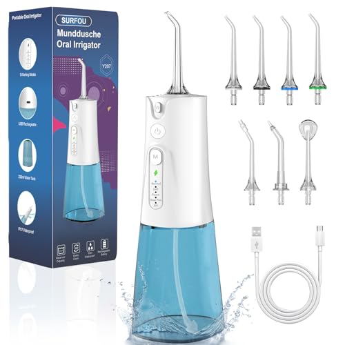 SURFOU Dental Jet Hydropulzer och irrigatorer 5 lägen 7 ändkåpor, IPX7 vattentät, uppladdningsbar USB typ-C och 230 ml vattentank för resor och hemmabruk